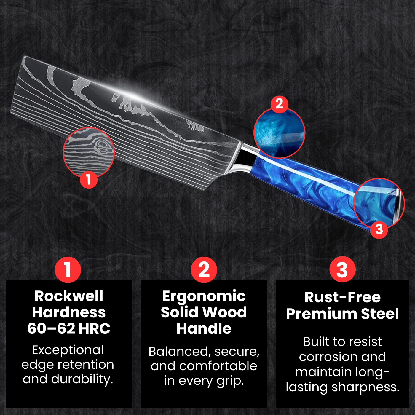 • Handle: Ergonomic Solid Wood or Elegant Epoxy Resin, balanced for comfortable, fatigue-free use.