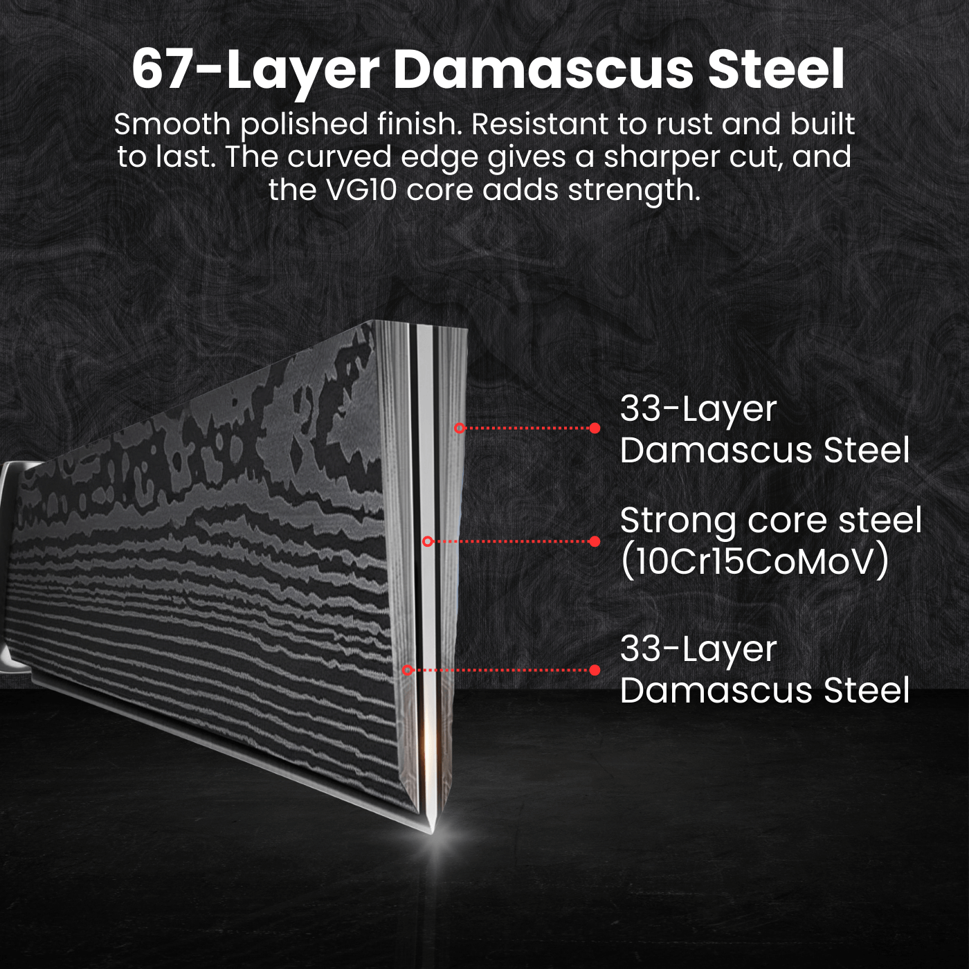 • Blade Material: Premium Hand-finished Damascus Steel (67-Layer VG10 Core or 33-Layer 10Cr15CoMoV Core).