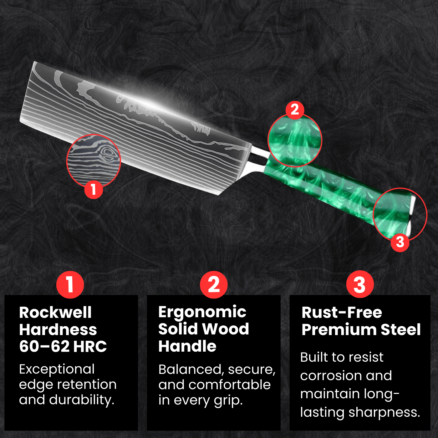 • Handle: Ergonomic Solid Wood or Elegant Epoxy Resin, balanced for comfortable, fatigue-free use.